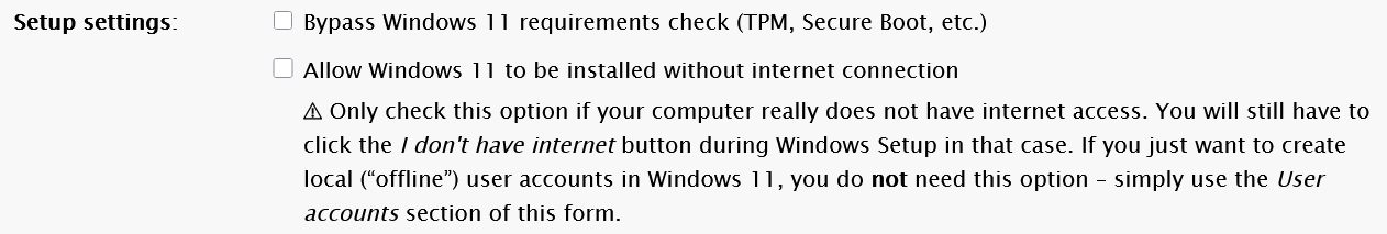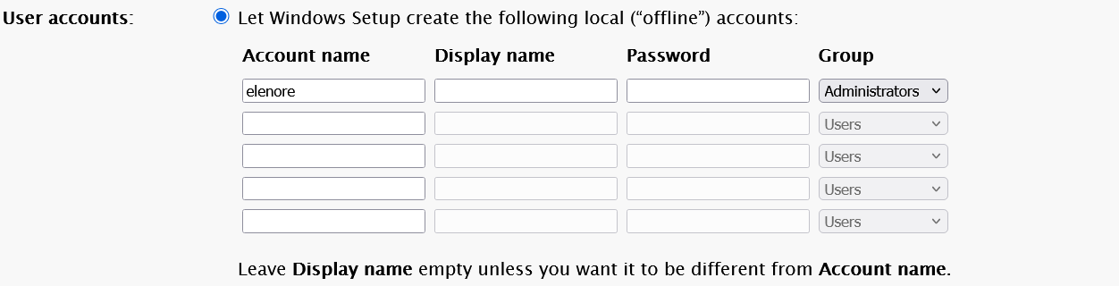 > User accounts:Let Windows Setup create the following local (“offline”) accountsユーザーアカウント:Windows セットアップで次のローカル(オフライン)アカウントを作成します