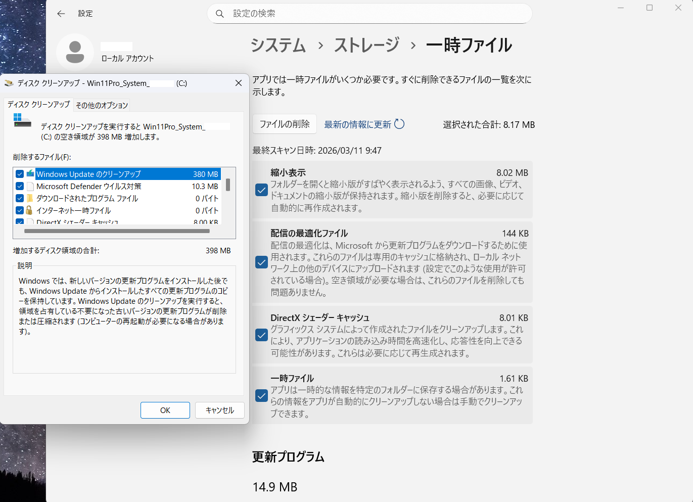 アップデート後に一時ファイルの削除などで Windows Update の