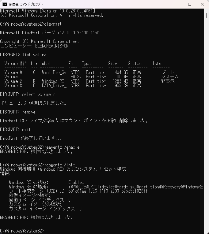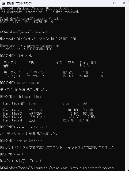 reagentc /disable(回復環境を無効に)diskpart(diskpart を起動)list disk(接続されているディスクをリストアップ)select disk x(x はシステムパーティション(回復パーティション)があるディスクの番号)list partition(パーティションをリストアップし、回復パーティションの番号を確認)select partition x(x は上で確認した回復パーティションの番号)assign letter=r(回復パーティションに仮のドライブレター r を設定)exit(diskpart を一度終了)reagentc /setreimage /path r:\recovery\windowsre(回復パーティションに回復環境を設定)(画像9)diskpart(diskpart を再度起動)list volume(接続されているディスクとドライブレターをリストアップ)select volume r(仮のドライブレターを割り当てた回復パーティションを指定)remove(仮のドライブレターを解除)exit(diskpart を終了)reagentc /enable(改めて回復環境を有効化)reagentc /info(回復環境が設定されたディスクとパーティションの位置を確認)(画像10)reagentc /enable で回復環境を有効化してここで終了です。エラーの場合は深刻な問題の可能性が高いと思われます。あるいはシステムがインストールされているディスク全体のシステムのバックアップイメージを作成し、何かあっても元に戻せるようにしてから、回復パーティションの再作成(拡張)に臨むと良いのではと思いますreagentc /disable で回復環境を無効化し…reagentc /disable で回復環境を無効化し…format quick fs=ntfs label="Windows RE tools"reagentc /enable(回復環境を有効化)reagentc /info(回復環境が設定されたディスクとパーティションの位置を確認)参考にさせて頂いたページ