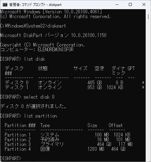 reagentc /info で回復環境の状態を確認(画像1)reagentc /enable で回復環境を有効にしてみます。BitLocker やデバイスの暗号化でエラーになる場合は、両方とも無効にして再度 reagentc /enable で有効化を試みますreagnentc /enable で回復環境の有効化を試みます。エラーにはならなかった場合や、回復パーティションが複数存在する、または回復パーティションが存在しない場合は、3.回復パーティションを確認するに進みます。回復パーティションが存在するのにエラーだった場合は、2.回復環境を初期化するに進みます。何をやってもエラーになる場合は深刻な問題の可能性が高いと思われます。修復インストールやクリーンインストールが必要になるかもしれませんreagentc /disable で回復環境を無効化reagentc /enable で回復環境を有効にするdiskpart(diskpart を起動)list disk(接続されているディスクをリストアップ)select disk x(x は、手順 1. で確認した回復パーティションが存在するディスクの番号)list partition(ディスクにあるパーティションをリストアップ)(画像8)exit で diskpart を終了reagentc /enable を実行し、回復環境を有効にします。エラーの場合は、4.回復パーティションのサイズを確認するに進みますreagentc /info を実行し、以下の例だった場合(画像1)