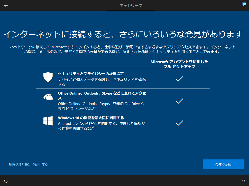 - インストールの途中で「ネットワークに接続しましょう」の問いには「インターネットに接続していません」の選択でローカルアカウントの設定に進めます(画像17 画像18)Win10 ではその後、左下の「制限された設定で続行する」を選択(画像19)