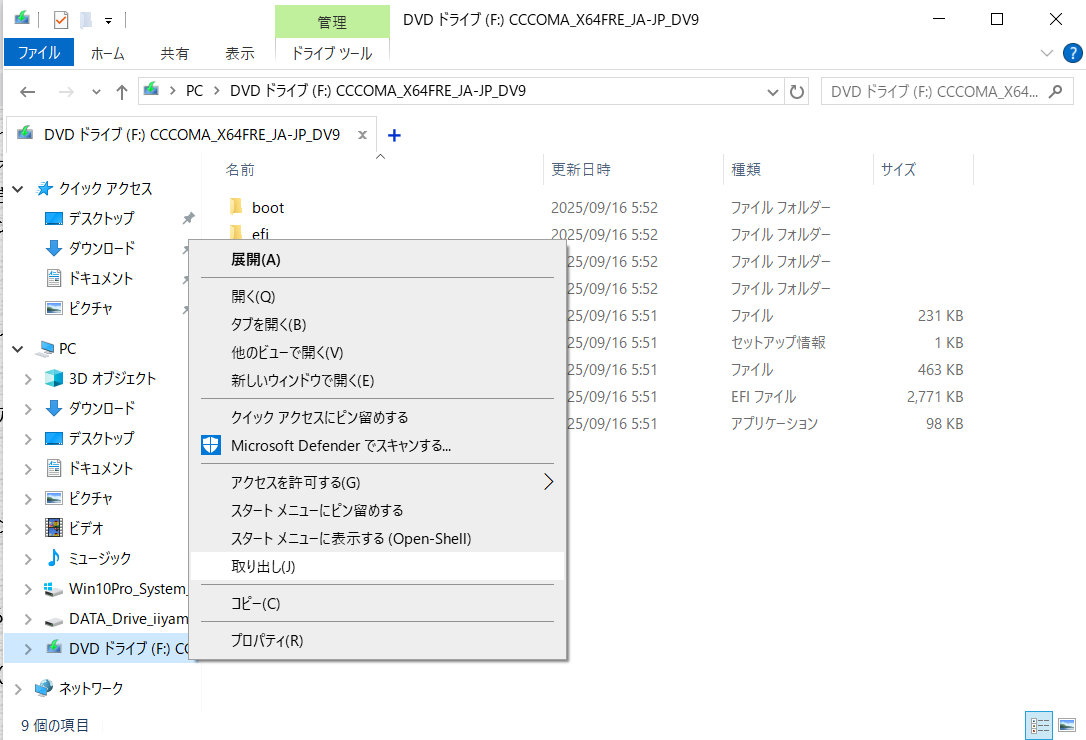 - iso ファイルを右クリックからマウントし、仮想ドライブとしてファイルを開けるようにします(画像13 画像14)