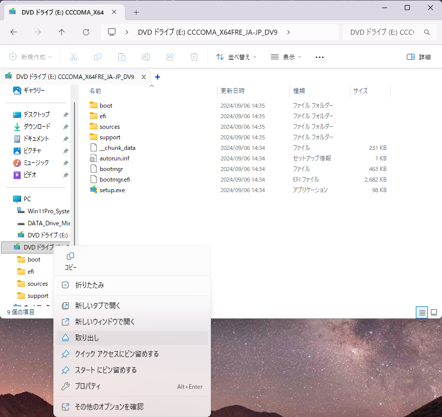 - インストールメディアや iso ファイルを使用して、起動中の Windows 上から修復インストールを行います